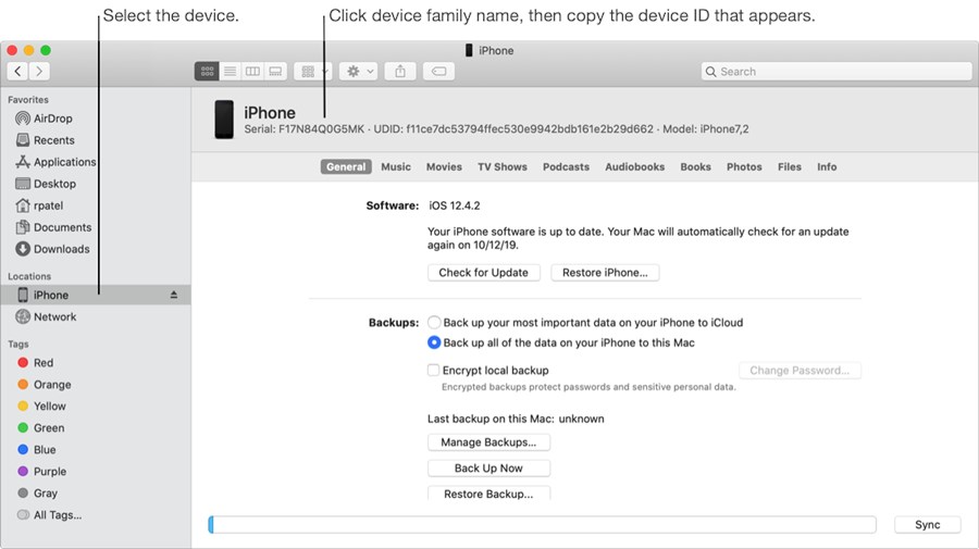 对于 iOS 和 tvOS 应用,您还可以使用 Finder 获取设备 ID。例如,如果外部测试人员没有安装 Xcode,他们可以按照这些步骤获取他